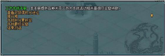 3、大侠可以在“游戏活动大使”处领取三节作战手册,查阅获取积分途径、积分累积排名、领取阶段奖励,三节积分可在