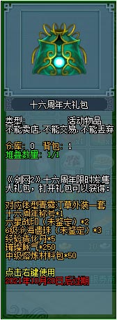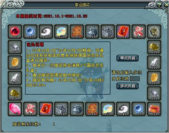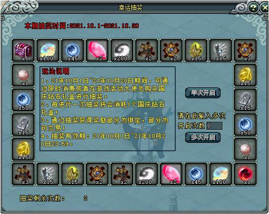 活动介绍:1、10月1日-10月7日期间,大侠每天在线120分钟,可从在线系统领取1个国庆欢庆礼盒。同时每日活跃度达到150,可从活 跃度系统领取2个国庆欢庆礼盒。右键点击国庆欢庆礼盒可以进行抽奖。2、10月1日-10月20日期间,大侠可以使用新年许愿砂在“游戏活动大使”处购买钻石礼盒进行抽奖,最多可以购买200个,钻石礼盒30新年许愿砂/个。