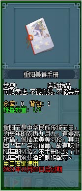 1、活动期间,大侠可以在“游戏活动大使”处领取“重阳美食手册”,上面记载了重阳糕菊花酒制作方法。