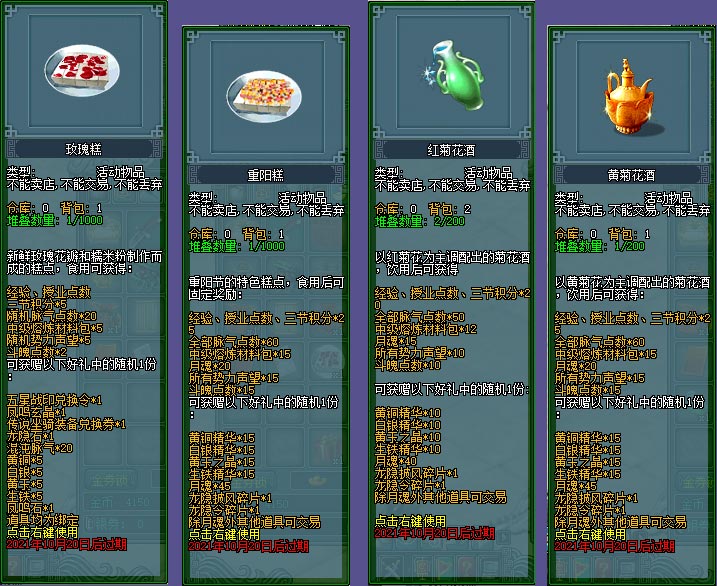 2、大侠参与以下功能可以获得重阳佳节美食袋,开启可获得各式材料。